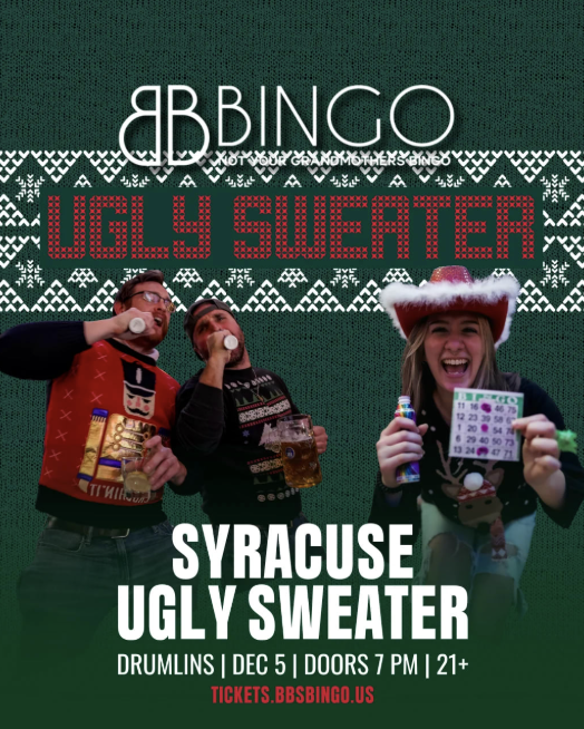 Buffalo’s wildest bingo party is headed back to Syracuse for our Ugly Holiday Sweater Special! Our last event completely sold out, so don’t wait to grab your tickets. If you missed the chaos last time, this is your chance to see what all the hype is about. Let’s run it back, Syracuse!!!!