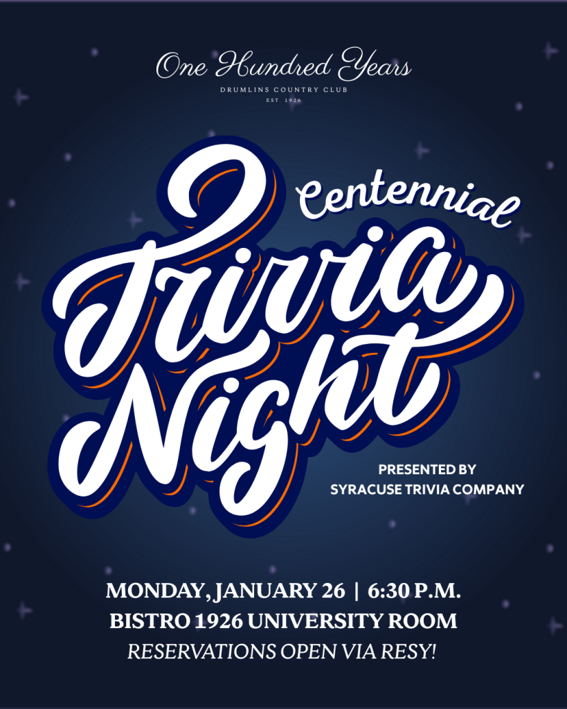 Join Bistro 1926 and Syracuse Trivia Company for our first Centennial event of the year. In honor of our 100th year, one round of trivia will be Syracuse / Drumlins themed, AND we have upgraded our space to accommodate more teams!